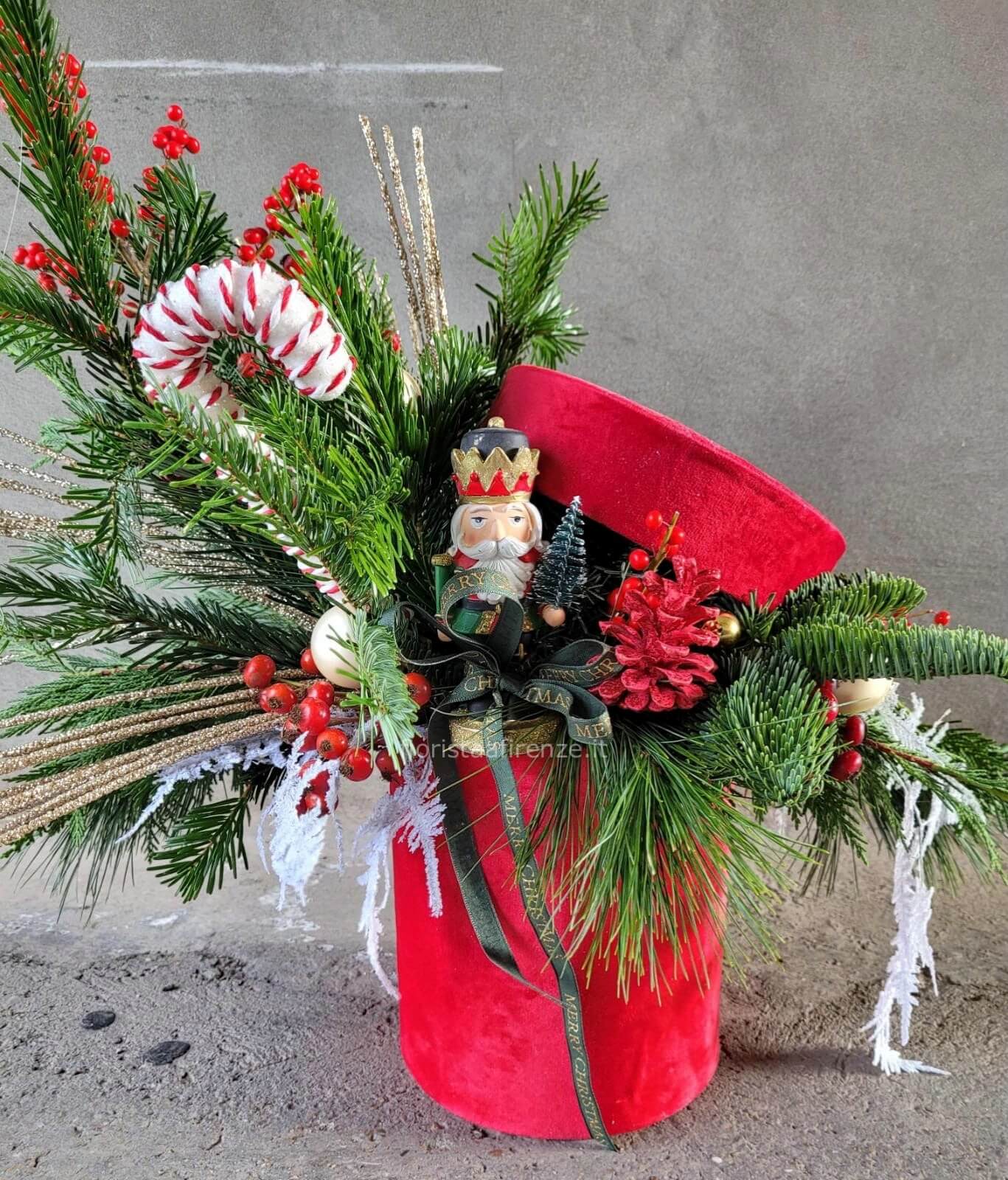 Cappelleriera natalizia in velluto con elementi di oggettistica, verdi natalizi e bacche